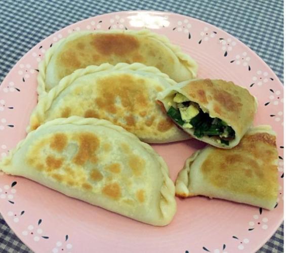 鍋貼包制時一般是餡面各半,呈月牙形。