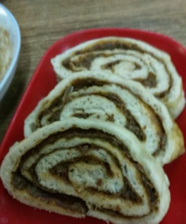 發好的面擀成餅,再在上面均勻的抹上一層肉餡
