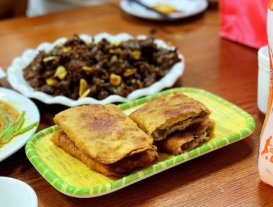 “回頭,是一種與鍋貼類似的食品,但較之鍋貼要稍大,包的餡也多,呈長方形,兩頭不封口,而且要向中間褶回,疊上即可,用油煎制而成。食用時佐以醋、蒜。”