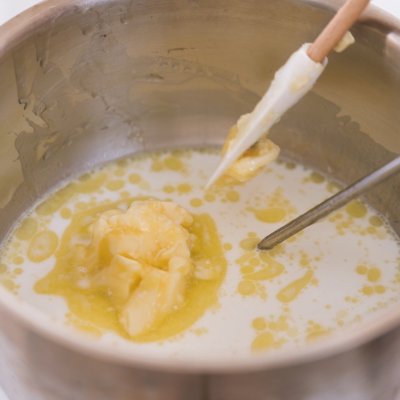 6 先預熱烤箱160度,然後把黃油和牛奶放入小鍋中加熱至50度以上黃油全部融化,關火。