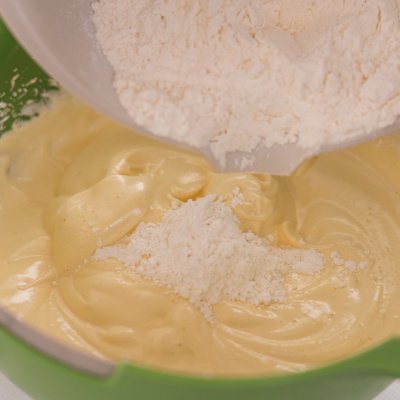5 把低筋麵粉過篩後全部倒入蛋糊中快速撈拌均勻