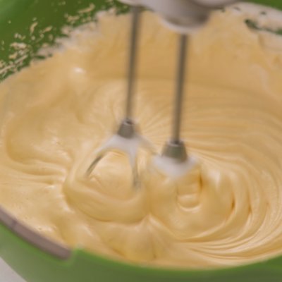4 依次把蛋黃加入到蛋白霜中,同樣高速打發,打發至蛋糊有光澤,花紋清晰可見。最後還是低速打發一下,均勻氣泡,讓蛋糊更細膩