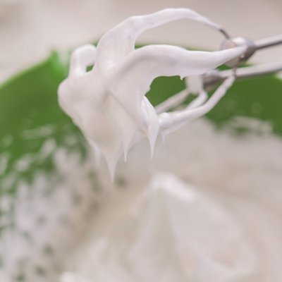 3 之後分兩次加入剩餘的白砂糖和水怡,一直打發到硬性發泡的狀態,然後打蛋器低速打幾圈,均勻下蛋白霜