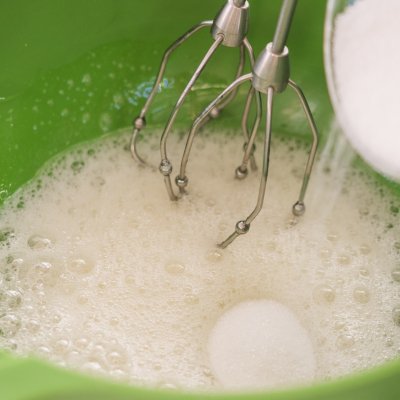2 雞蛋分出蛋白和蛋黃,蛋黃先放在盆中備用,蛋白放在一個無油無水的盆裡先打發出粗泡,體積膨脹的狀態加入三分之一的白砂糖高速繼續打發